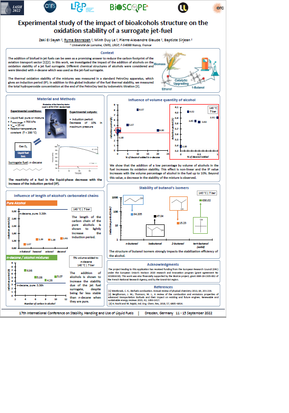 Ryma a également présenté un poster sur l’impact expérimental de la structure des bio-alcools sur la stabilité à l’oxydation d’un carburéacteur modèle.