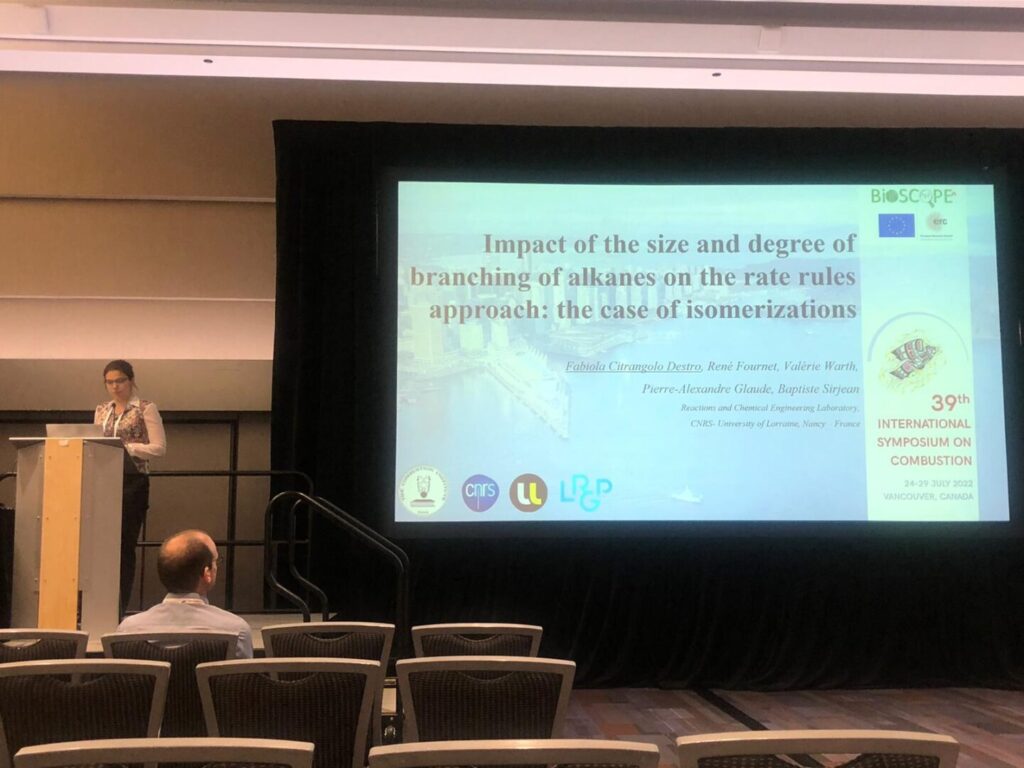 Fabiola a présenté ses travaux de thèse au 39th International Symposium on Combustion qui s’est déroulé du 24 au 29 juillet 2022 à Vancouver (http://www.combustionsymposia.org/2022/). Ses résultats sur l’impact de la taille et du degré de branchement des alcanes sur l’approche « règles de réaction », appliqué au cas des isomérisations, ont été sélectionnés pour une présentation orale.