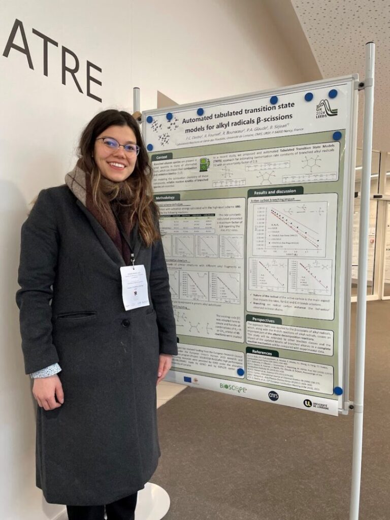 Sur son poster, Fabiola a présenté l’extension de la méthode des états de transition tabulées, développée lors de sa thèse pour les isomérisations des radicaux alkyles, à la famille des réactions de β-scissions des radicaux alkyles.